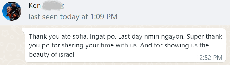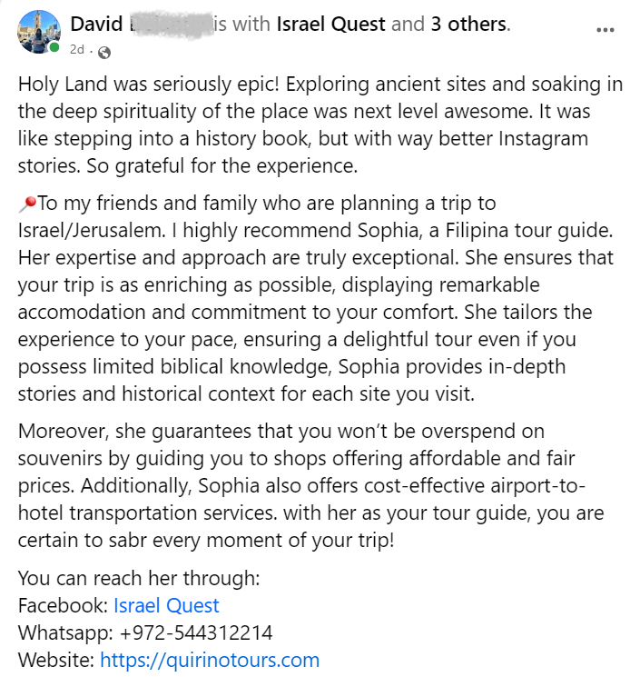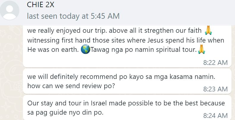 Tour the Holy Land with a Filipino tour guide. Visit Christian and pilgrimage sites; archaeological and historical sites; Nature and Reserves; Jewish Synagogues and museums and many more…