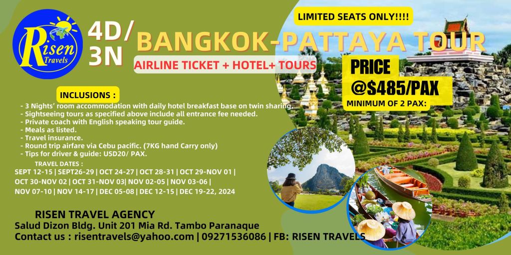 Arrive : Bangkok- Pattaya | AIR/ BUS ETA: 5J 929 MNLBKK 0730-1000 Arrival at BKK Airport, meet the guide. Transfer to Pattaya. Visit Ice Cream World. Visit Khao Chi Chan. Visit Pattaya Night Market. Transfer to hotel and check in. 3* Zand Morada Pattaya or similarDay 3 Pattaya/ Bangkok BUS | B/L/X – Hotel Breakfast. – Transfer to Bangkok. – Visit Jewelry Exhibition and Processing Center. – Visit The Ancient City. – Visit Pratu Nam Market. – Transfer to hotel and check in. Optional tour: Thai Massage USD25/ PAX 3* Praso @ |Ratchada 12 or similar